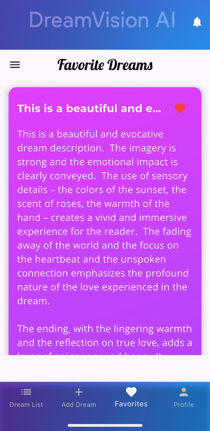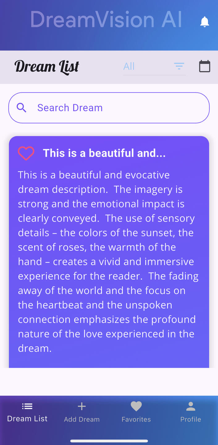 Our app helps you unlock the hidden meanings behind your dreams, whether they are peaceful, adventurous, or even nightmares. With cutting-edge artificial intelligence, Dream Vision Ai provides fast, accurate, and personalized dream interpretations that go far beyond traditional dream books or dictionaries.Dream Vision Ai also serves as a complete dream journal. You can record your nightly visions, explore symbolic meanings, and track recurring themes over time. From lucid dreaming to subconscious insights, the app gives you the tools to better understand yourself and your inner world.By combining science, psychology, and spirituality, Dream Vision Ai helps you connect with your subconscious, reduce anxiety, and find inspiration through the messages hidden in your dreams.